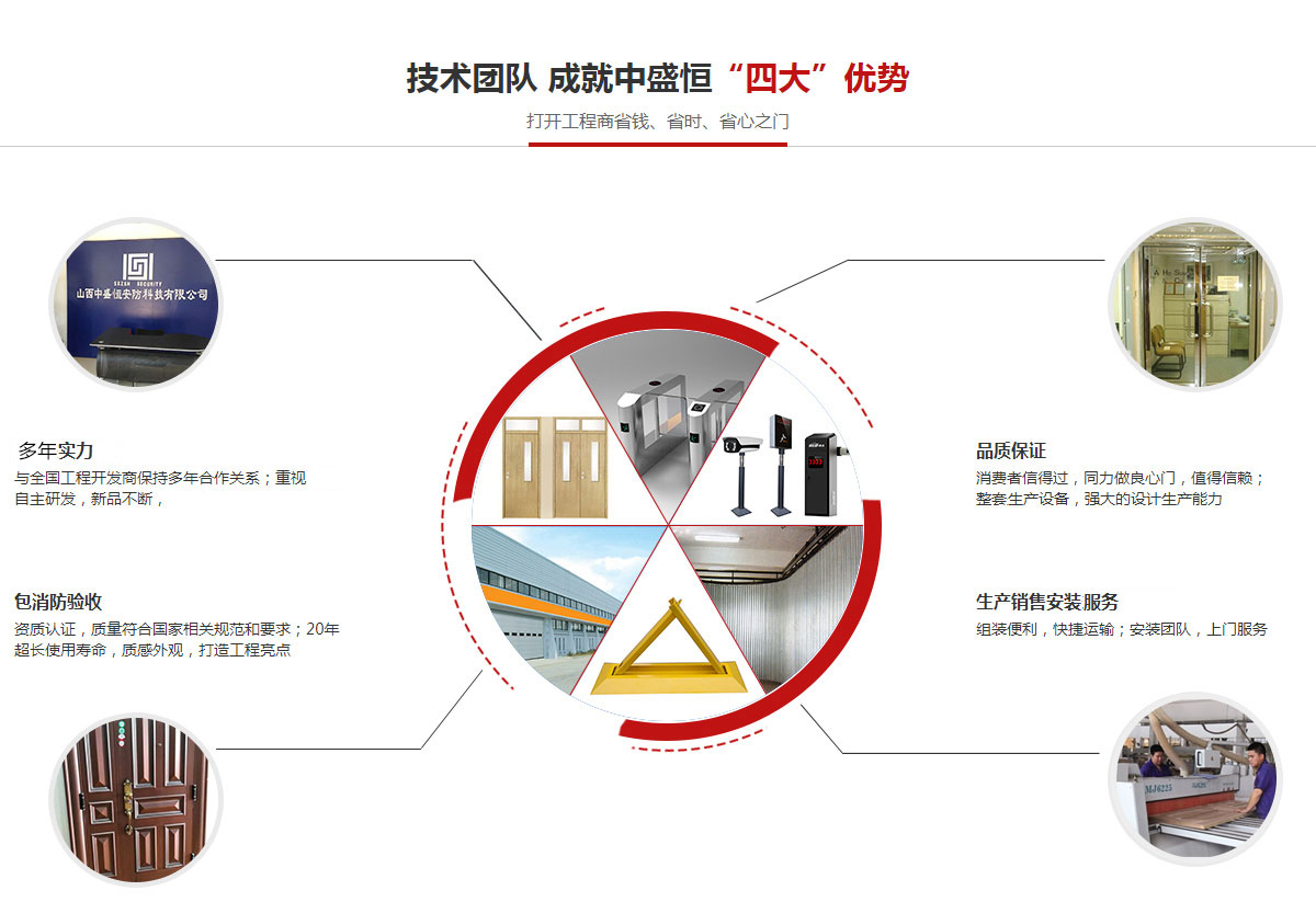 山西中盛恒安防科技有限公司成立于2010年,地處人杰地靈的山西省省會——太原市,公司注冊資金200萬元人民幣,從事自動旋轉(zhuǎn)門、伸縮門、卷簾門、車庫門、工業(yè)門、防火門、防爆門、防盜門、智能樓宇系統(tǒng)及建筑幕墻、門窗、綜合裝飾工程,是集科研開發(fā)、設計、施工、售后服務于一體的綜合性股份制企業(yè)。